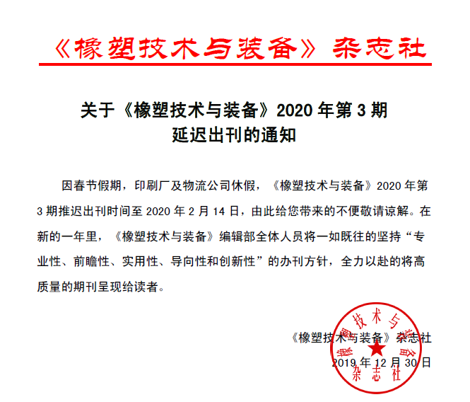 【通知】關(guān)于《橡塑技術(shù)與裝備》2020年第3期延遲出刊的通知因春節假期,印刷廠(chǎng)及物流公司休假,《橡塑技術(shù)與裝備》2020年第3期推遲出刊時(shí)間至2020年2月14日,由此給您帶來(lái)的不便敬請諒解。在新的一年里,《橡塑技術(shù)與裝備》編輯部全體人員將一如既往的堅持“專(zhuān)業(yè)性、前瞻性、實(shí)用性、導向性和創(chuàng )新性”的辦刊方針,全力以赴的將高質(zhì)量的期刊呈現給讀者。 《橡塑技術(shù)與裝備》雜志社 2019年12月30日 2019-12-30 【中心動(dòng)態(tài)】 -